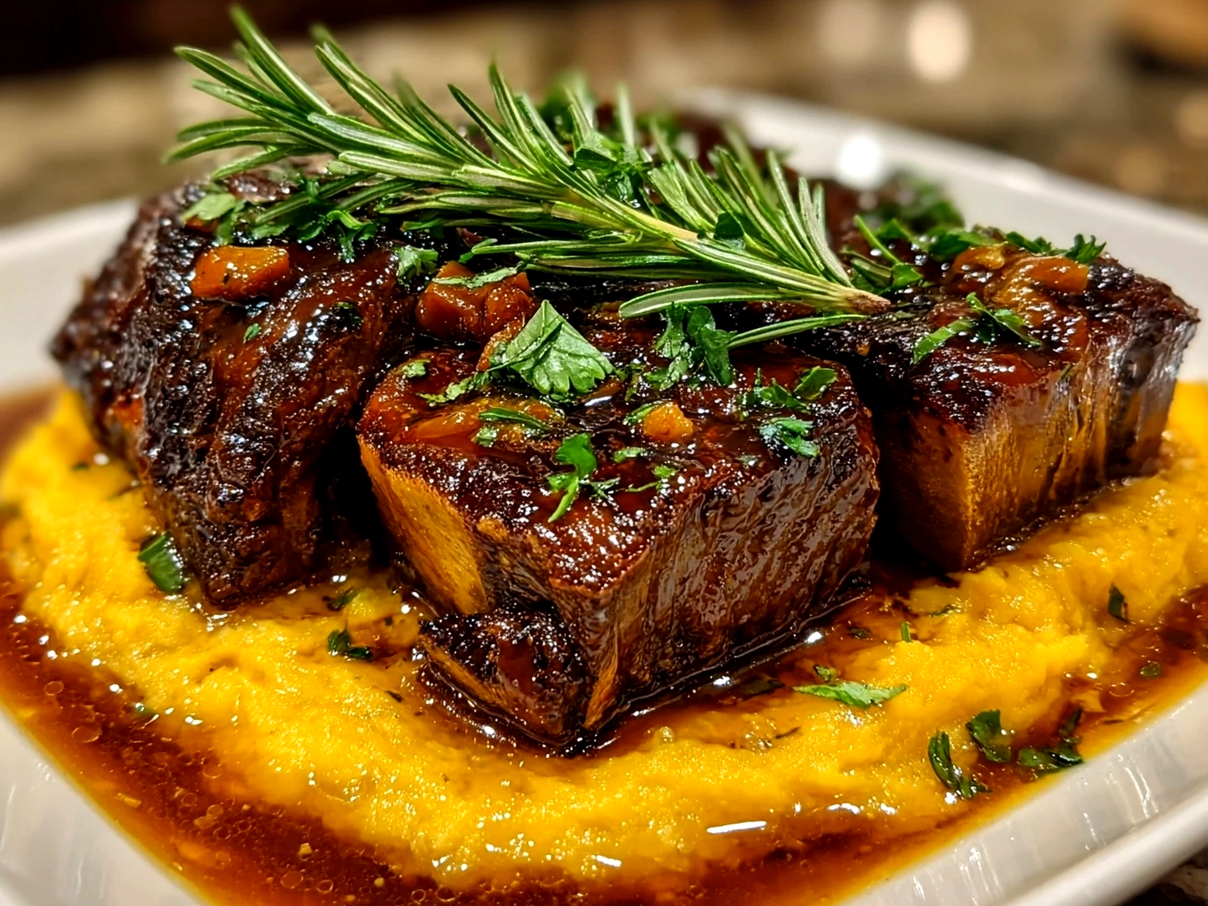 - Serve short ribs over a bed of rosemary mashed sweet potatoes, garnished with fresh parsley.