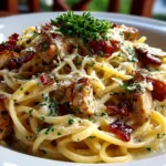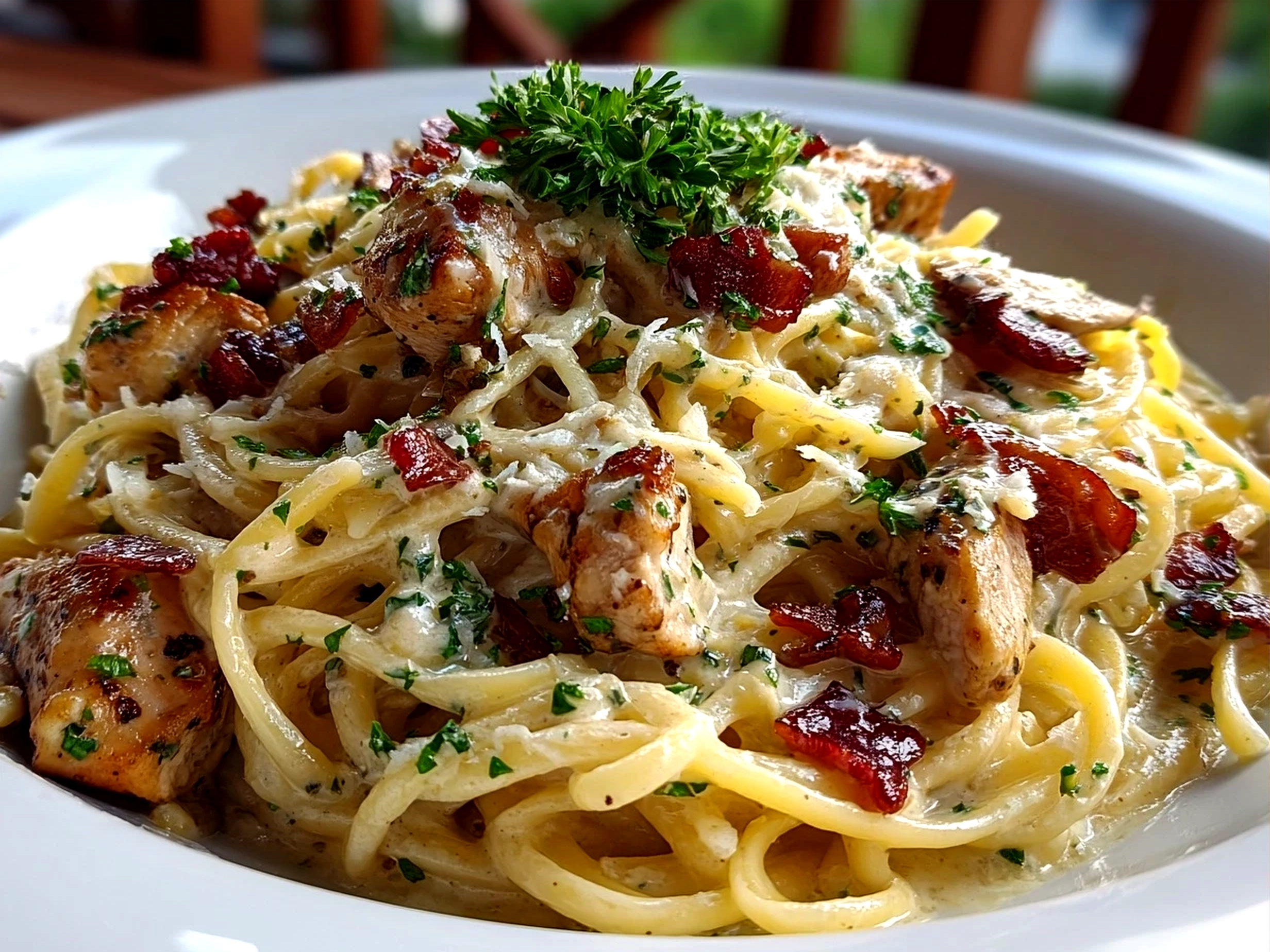 Chicken Carbonara is a creamy Italian-inspired pasta dish combining tender chicken, crispy pancetta, and a rich egg-based sauce for a comforting and flavorful meal.