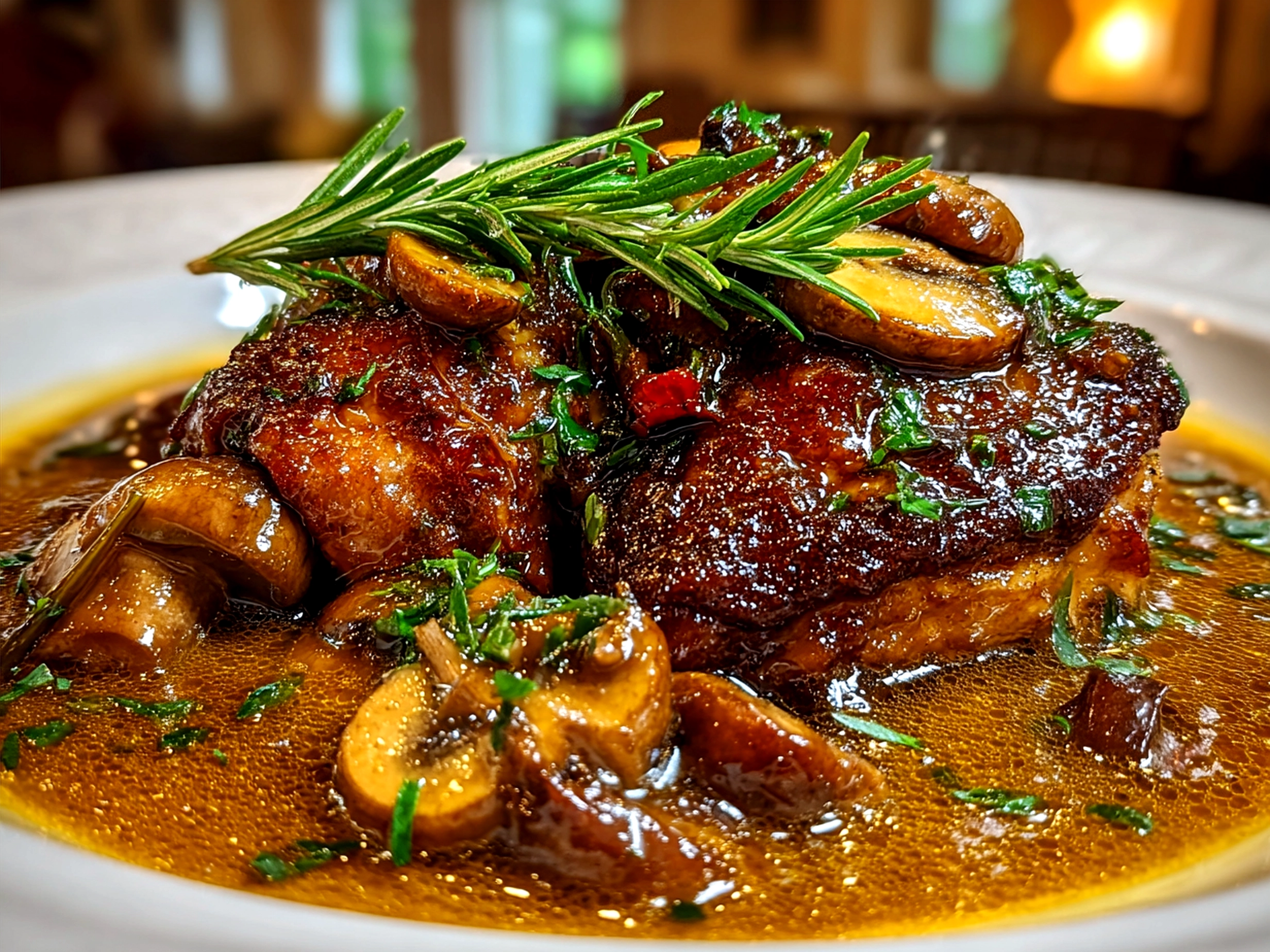 5. Braise low and slow: Return the chicken to the pot, skin side up. Cover and simmer gently on low heat for about 45 minutes to 1 hour. Your kitchen will fill with the rich aroma of braised chicken with mushrooms and wine—perfect time to appreciate the aromatic transformation!
