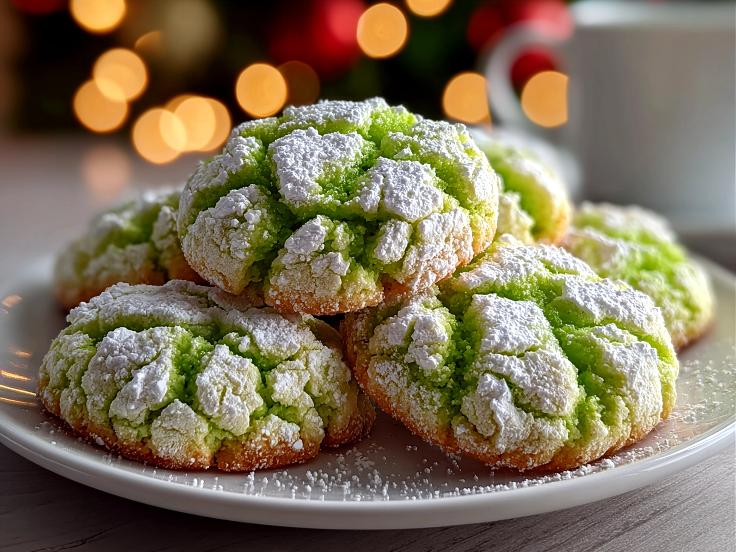 I like to present my Grinch holiday treats stacked on a rustic plate dappled with fresh rosemary sprigs. It makes the powdered sugar crinkle cookies look like they’re dusted with winter snow. Presentation helps highlight the authentic flavors and reminds everyone these treats were made with care and tradition.