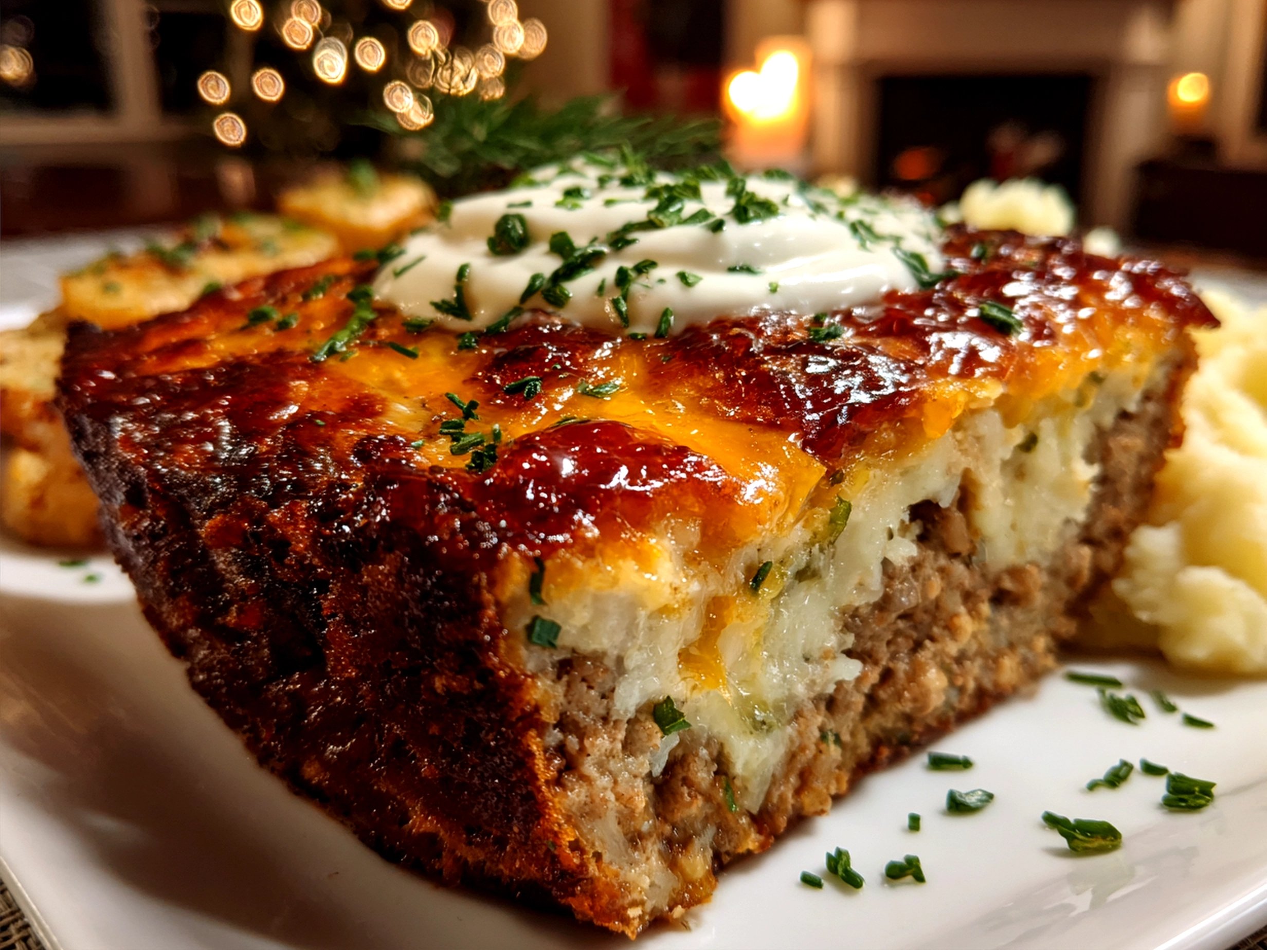 The family gathers quickly when this aromatic Loaded Potato Meatloaf appears with a side of steamed green beans and a crisp garden salad. These simple sides balance the rich, cheesy potato meatloaf flavors perfectly.