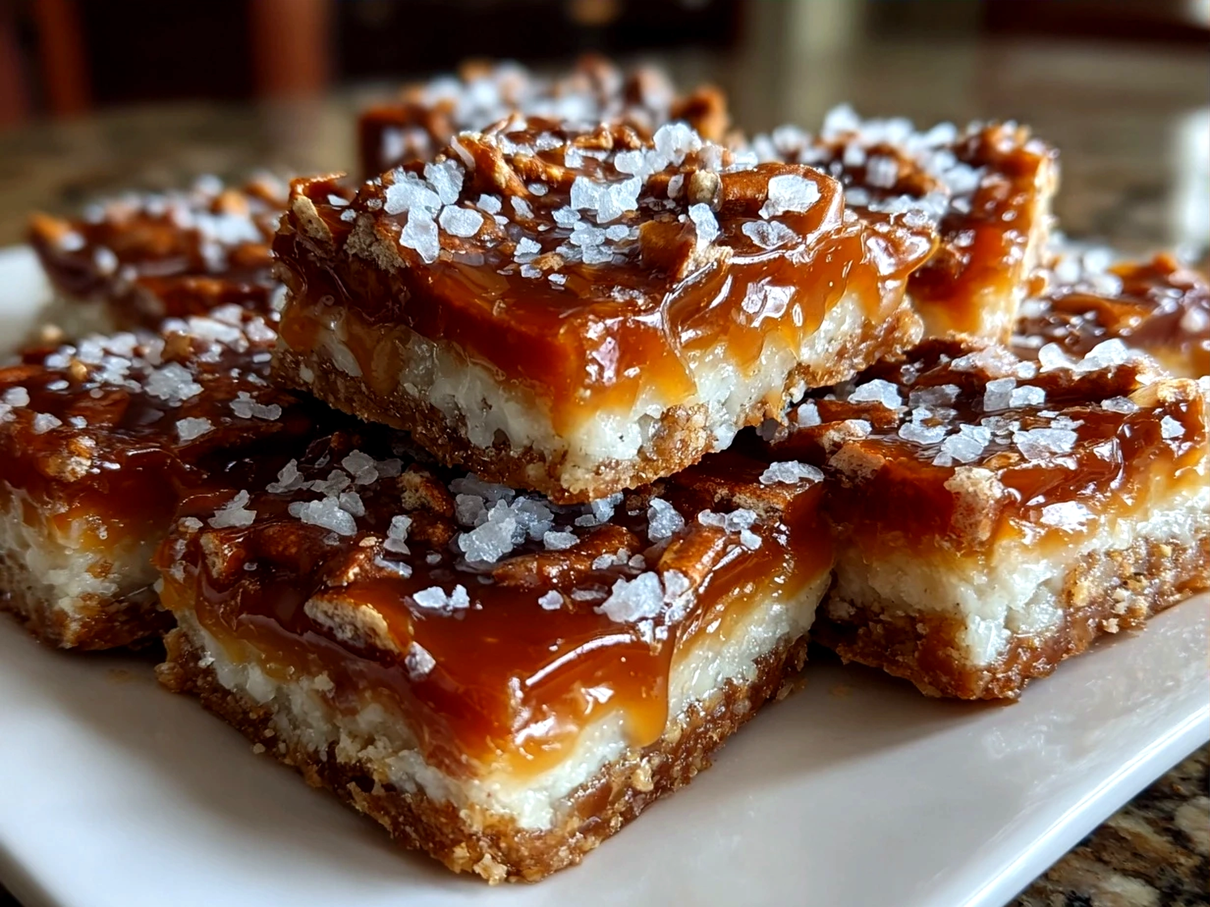 Delight in these easy no bake salted caramel pretzel bars that combine crunchy pretzels with rich caramel and a hint of sea salt for the perfect sweet and salty treat.