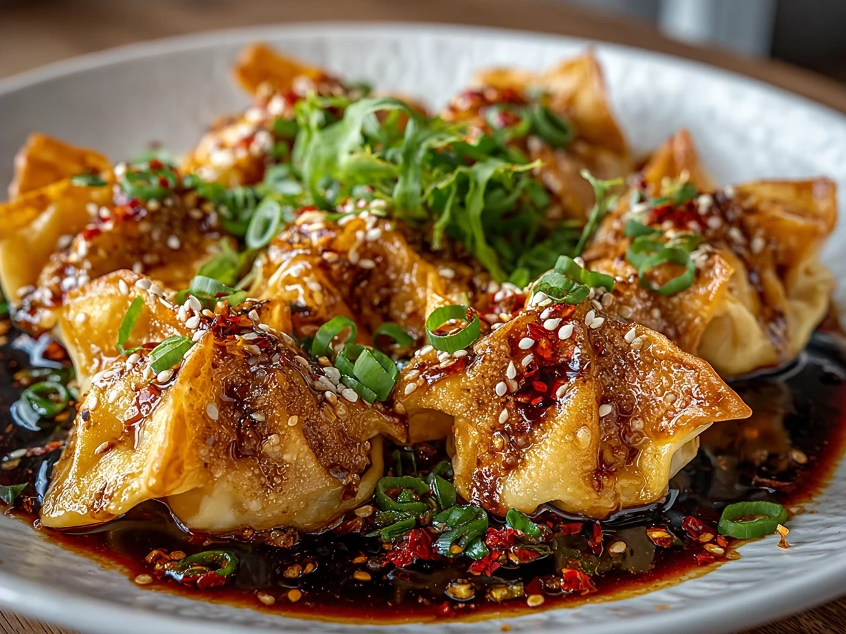 Deliciously crispy wontons filled with a spicy pork mixture, served in a vibrant homemade chilli sauce that perfectly balances heat and flavor.