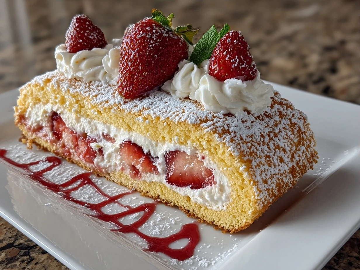 This Strawberry Cream Cake Roll is a light and fluffy dessert featuring a tender sponge cake rolled with fresh strawberry cream filling, perfect for a delightful treat.