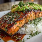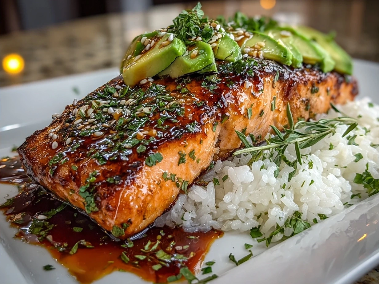 Delicious teriyaki-glazed salmon served over a bed of fluffy rice and creamy avocado, creating a perfect balance of savory and fresh flavors in this easy-to-make dish.