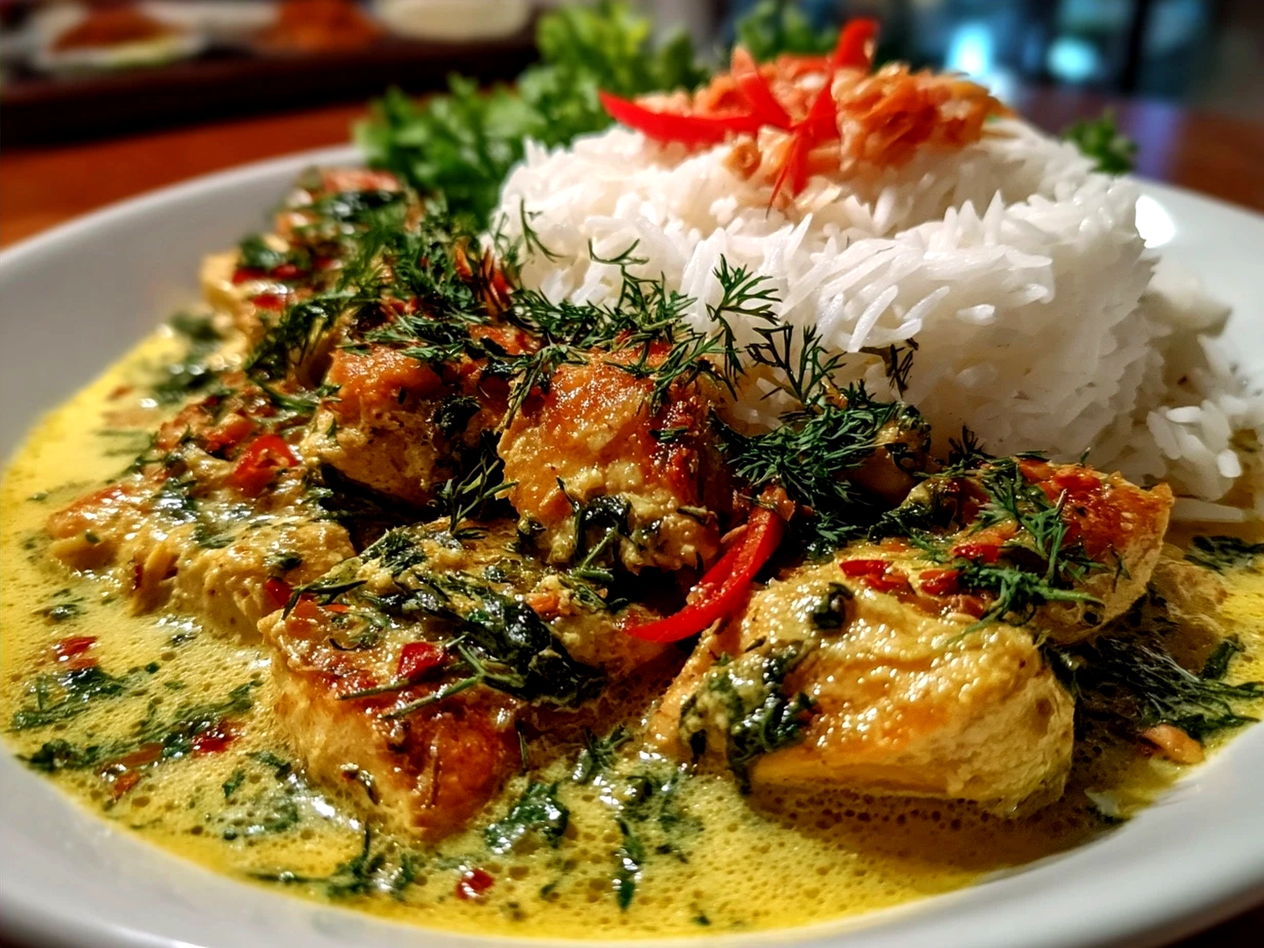 A flavorful Thai chicken curry simmered in creamy coconut milk with aromatic herbs and spices, delivering a perfect balance of spice and sweetness.