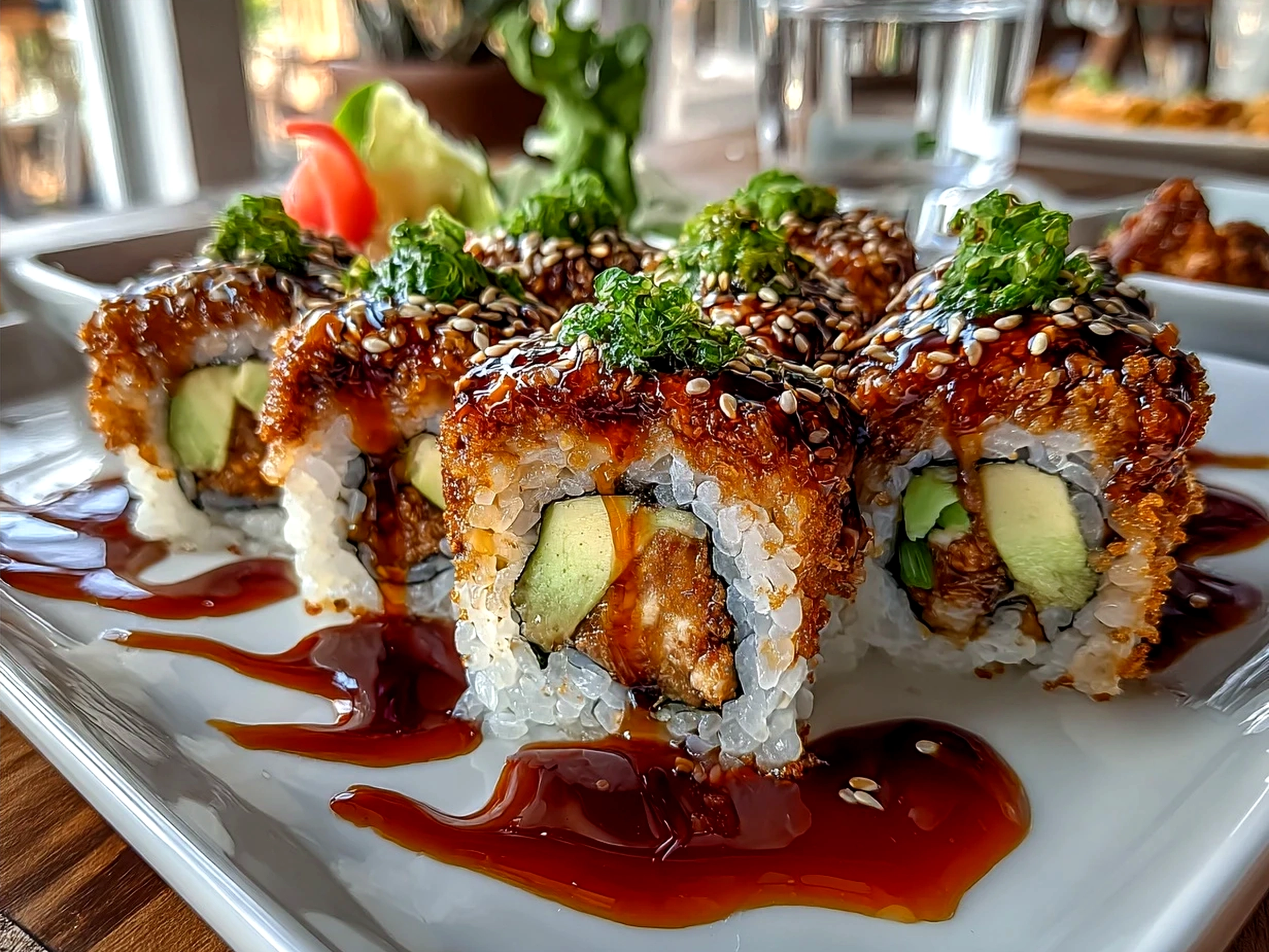 – Toasted sesame seeds and nori strips adding layers of nutty, oceanic notes.
